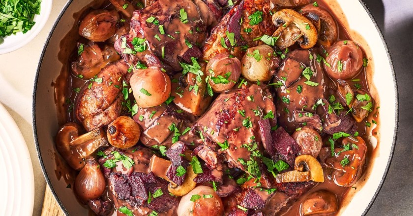 Coq au Vin is a quintessential French dish where chicken is slowly braised in red wine, with mushrooms, onions, and bacon enriching the flavors.
