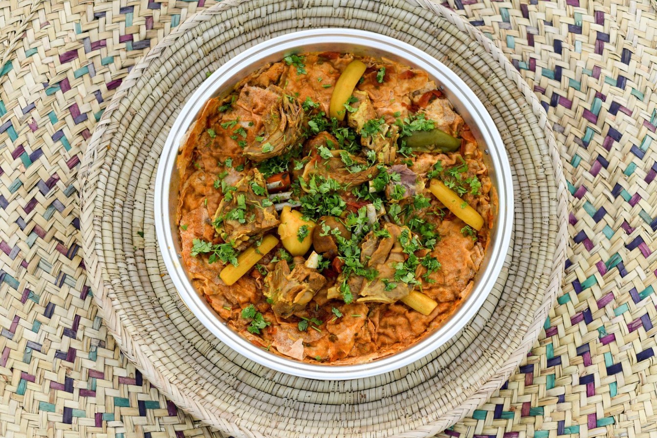 Cook chicken with vegetables and Arabic spices. Tear bread and place in bowl. Pour stew over it to soak. Soft, rich and mostly served during Ramadan.